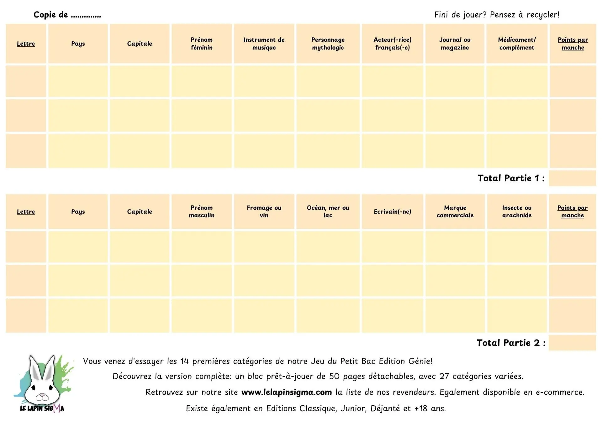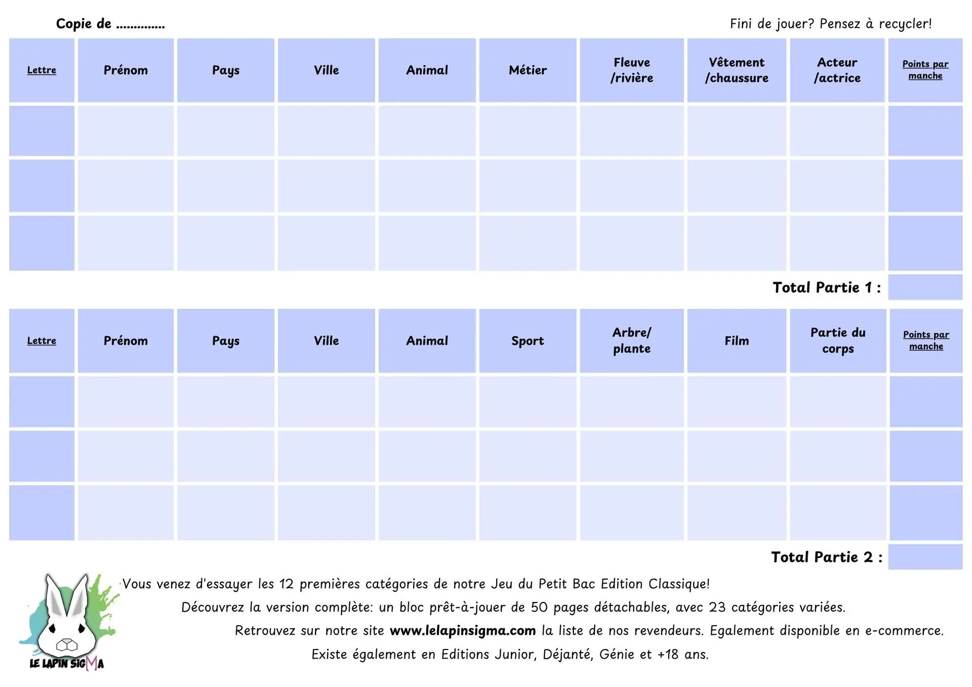 Cliquer pour télécharger le fichier à imprimerVous avez aimé? Des versions intégrales sont disponibles à la vente dans le commerce. Au programme: des blocs de 50 pages prêt-à-jouer avec 2X plus de catégories par feuille, et une impression de qualité professionelle en couleur. Fabriqué en France bien sûr!